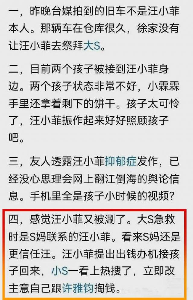 但是问题是,大 S 都走了,孩子的抚养权不给自己有钱有资源的亲爹,难道给自己照顾不了的后爸,孩子一堆的小姨,需要别人照顾的外婆?