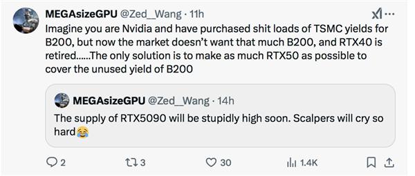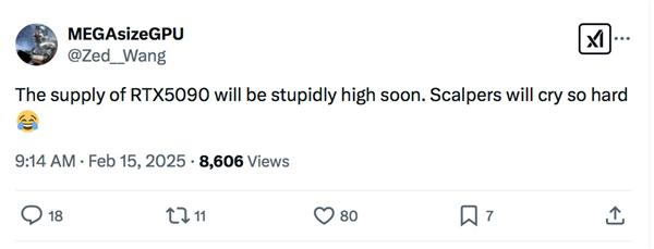 他还在回复中说,RTX 5090 供应将很快变得“异常充足”,至少有一个家庭。 AIB 合作伙伴已经有了大量的库存。