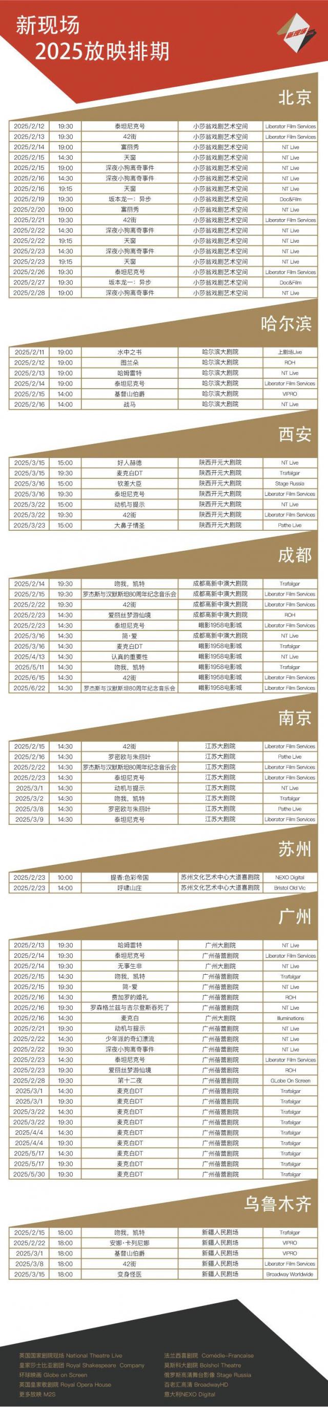 "新现场"超清播放系列由北京奥哲维文化传播有限公司打造,致力于向观众呈现当今世界舞台上最好的作品。通过和包括英国国家剧院、特拉法加发行公司、全球绘画、电影院、松竹有限公司、百老汇高清、法国百代、西班牙数字图像包括多个品牌合作,目前“新现场”超清播放系列的推广来自国家剧院、皇家莎士比亚剧团、皇家歌剧院、莎士比亚环球剧院、莫斯科剧院、法兰西喜剧院、世界顶级戏剧、歌剧、舞蹈、展览影像等多个机构。截至 2024 年 8 月亮,“新现场”播放曲目已经到了。 300 涵盖北京、上海、广州、台北、香港等部门。 69 地面,播放超过 11400 场地,观影人数超过 85 万人。