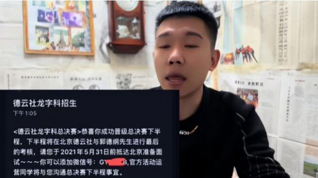 然而,面试的第一天,小黑龙发生了意外。他当场被淘汰,成为当天唯一被淘汰的学生。当他的心死了,他准备离开,但没想到德云社的董事长王惠亲自去他的直播间留住了他。