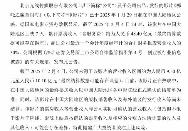 2 月 5 当天晚上,光媒宣布,根据国家电影专资办公室的数据,截至目前, 2025 年 2 月 4 日 24 当时,《哪吒魔童闹海》在中国大海。 陆地区上映 7 天啊,电影的票房收入(包括服务费)大约是人民币 48.4 1亿元(最终清算数据可能有偏差)。光媒来源于这部电影的营业收入范围约为人民币。 9.5 亿元至人民币 10.1 1亿元(最终清算数据可能有偏差)。