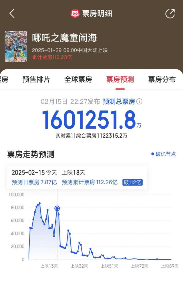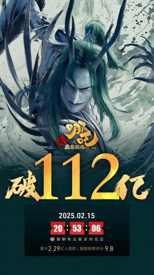 根据猫眼专业版本 App 数据显示,截至 2 月 15 日 20 时 53 分,电影《哪吒魔童闹海》票房破裂 112 累计观影人数为亿元 2.29 亿人。