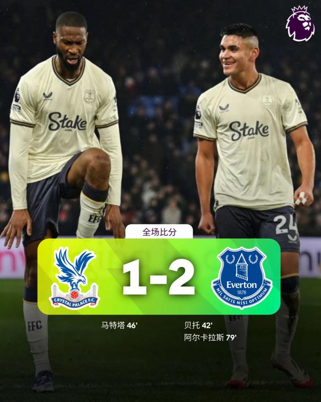 埃弗顿最终客场比赛 2-1 击败水晶宫,阿尔卡拉斯当选球迷评价全场最佳球员。