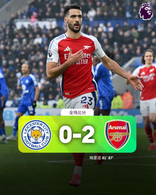 最终,阿森纳客场比赛 2-0 击败莱斯特城,梅里诺当选球迷评价全场最佳球员。