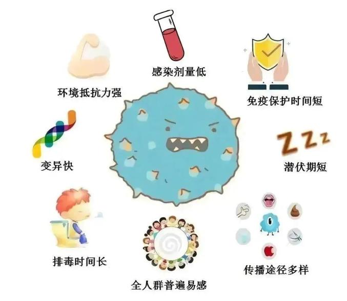 诺如病毒具有普遍易感、感染剂量低(低至18个病毒颗粒可引起感染)、感染后潜伏期短(通常24-48小时)、排毒时间长(排毒高峰在发病后2-5天,持续约2-3周)、外部环境抵抗力强(可以在0-60℃范围内生存)、免疫力保护时间短(感染后免疫保护持续6-24个月,同一体可以反复感染同一毒株或不同毒株的诺如病毒)等特征。