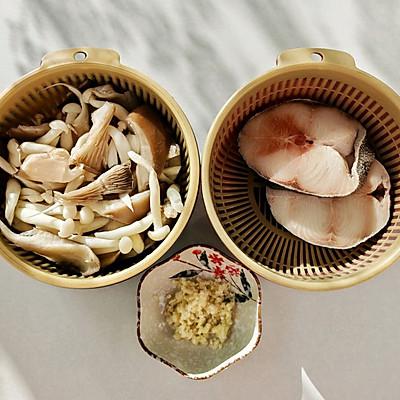 1、在图片中准备蘑菇 大蒜和阿拉斯加黑鳕鱼