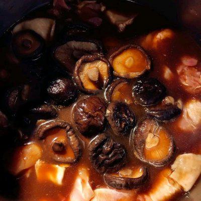 8、泡好的蘑菇,压力锅上的气压,开中小火压。 3-5 分钟 熄火炖半小时进味(压力锅不要压得太久,鸡肉烂得太久)