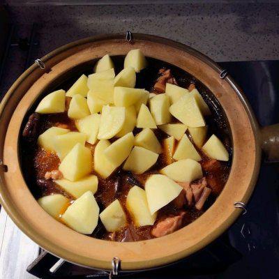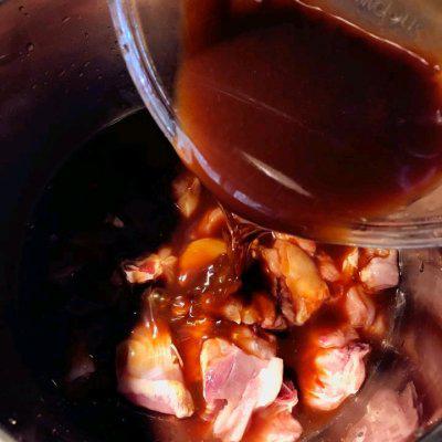 7、将鸡块放入压力锅中加入酱汁, 片姜片