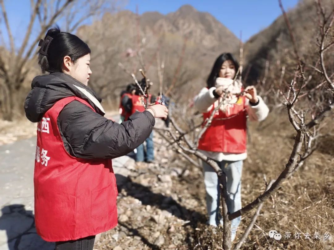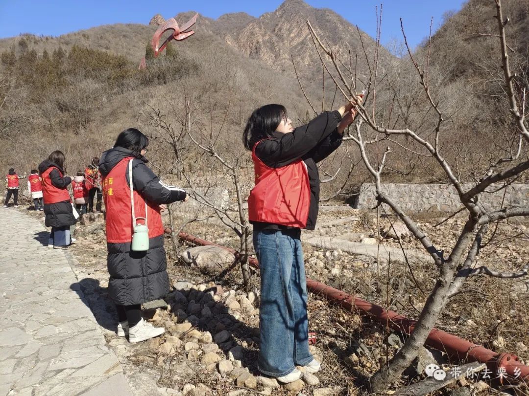 在喜峰雄关大刀园的果园里,回家的同学们拿着剪刀,小心翼翼地为果树修剪树枝。虽然动作有点陌生,但大家都很有活力。