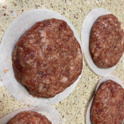 3、调好后静止 10-15 几分钟,让它尝起来很好吃。然后大小均匀,形成肉丸。然后碾成饼状,左右手来回更换,摔倒,用力定型。做好之后,放在油纸上,方便存放。