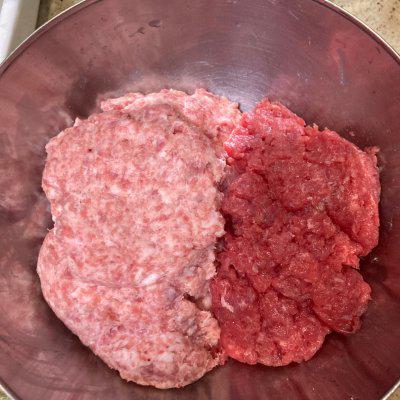 2、牛肉和猪肉混合成泥,与调味料混合,向一个方向搅拌。(汤冻是猪肉汤凝固后的晶体,通常存放在冰箱里冷藏,用于馅料,不容忽视。)