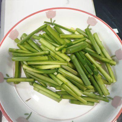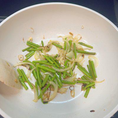 4、将葱条放入热锅冷油中,翻炒至有香味,然后倒入芦笋段,翻炒一分钟,加入胡萝卜条。我家没有胡萝卜,所以没有加。撒盐,放松新鲜调料,放在盘子里。
