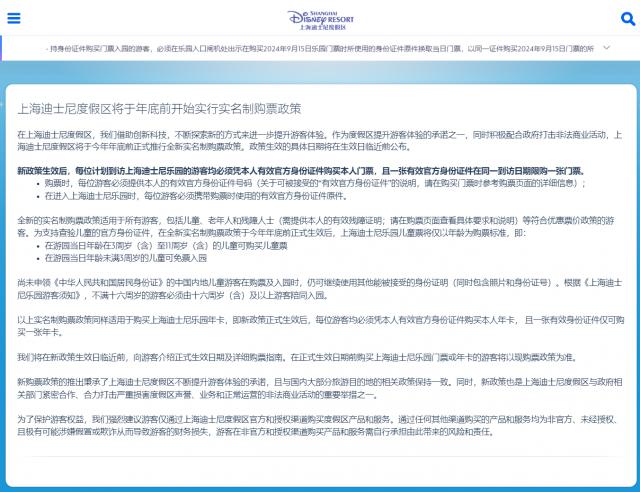 9 月 24 日早上 10 当时,上海迪士尼乐园官网显示,全新实名制购票政策将于今年年底前正式实施,政策生效的具体日期将在生效日临近前公布。