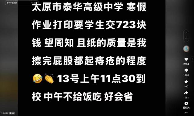 一位山西网友发布的视频显示,“太原市泰华高级中学,寒假作业要交学生。 723 这位网友说,这些打印纸质量很差。还有网友表示,723 元是每一位高一学生收取的打印费,每一位高二、高三学生各自收取。 776 元、826 人民币,而且学校只收现金。奔流新闻记者多次联系视频上传者核实情况,但没有得到回复。