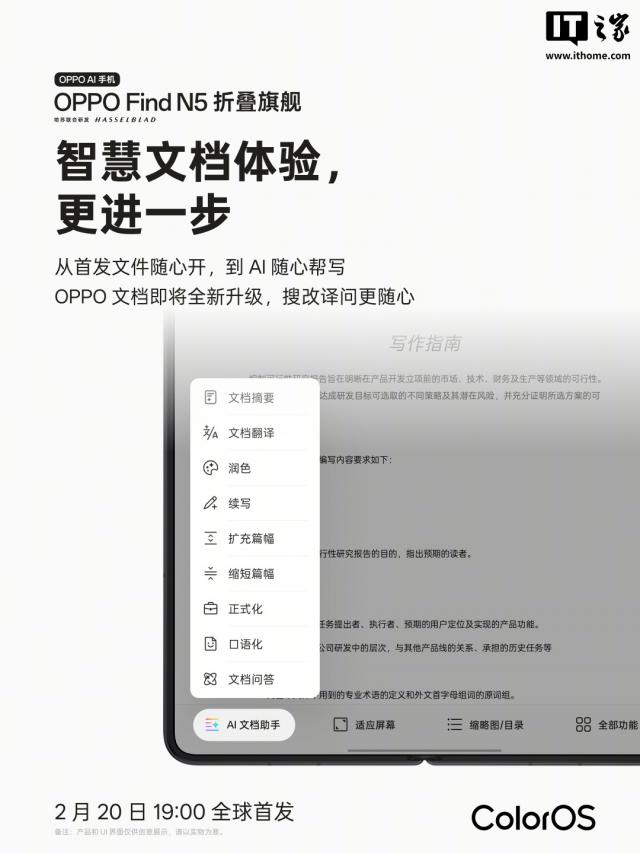 IT 世家 2 月 16 日消息,OPPO 今天正式发文预热 Find N5 折叠式手机:新机配备 ColorOS 15 系统,预装全新 OPPO 文档,适应“搜索和翻译问题”的使用场景(预热图显示支持文档摘要、文档翻译、润色、继续写作、扩大篇幅、缩短篇幅、正式化、口语化、文档问答等功能)。