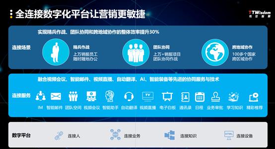 在这一系统中,除了连接场景外,还连接着企业的各种服务。在整个 LTC 在铁三角的运行过程中,邮件服务、数据服务、企业赋能、视频会议、自动翻译系统、电子白板、通讯录、业务审核等。都在这个系统中运行。所以它把情景联系起来,然后把每一项服务联系起来,直到把整个营销系统的人、货、场的服务联系起来。最后,企业的数字平台将人、业务、知识、设备的“人、货、场”全部连接起来,进而实现整个营销的赋能。这些都是完全连接的数字系统(见下图)。