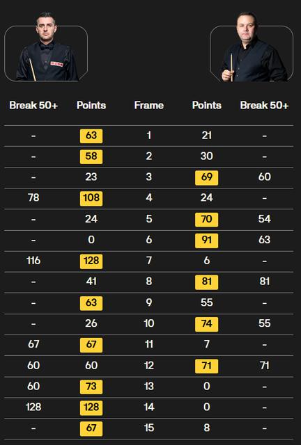 第 15 比赛,塞尔比单杆 35 分后,K 球运不佳中断。马奎尔失去了追分的机会,随后长台失误送了一份大礼,塞尔比再次上手,锁定胜局,连胜 3 局,9-6 击败马奎尔。