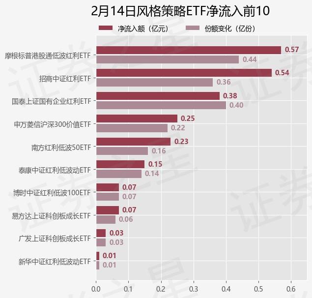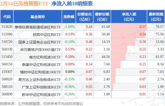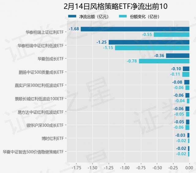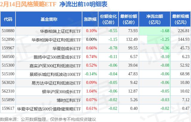 证券之星消息,2 月 14 日风格策略 ETF 总资金净流出基金 1.56 亿元,近 5 一个交易日累计净流出 2.08 亿元,5 在一个交易日内,出现了日合计资金净流出。 3 天(ETF 计算资金流入的方法:(当日 ETF 现场流通份额 - 前一交易日 ETF 现场流通份额)* 当天 ETF 均价,数字仅供参考)。