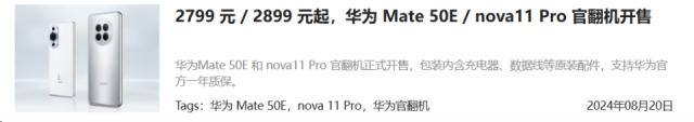 再早一点,还可以看到华为。 Mate 50E 和 nova 11 Pro 这几款老款被官方翻新出售。