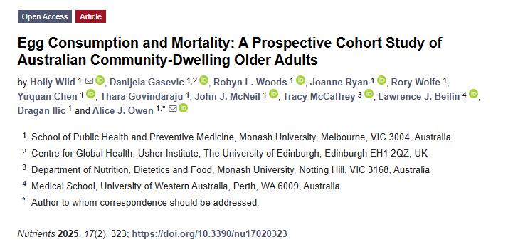 [1] Wild H, Gasevic D, Woods RL, Ryan J, Wolfe R, Chen Y, Govindaraju T, McNeil JJ, McCaffrey T, Beilin LJ, Ilic D, Owen AJ. Egg Consumption and Mortality: A Prospective Cohort Study of Australian Community-Dwelling Older Adults. Nutrients. 2025 Jan 17;17(2):323. doi: 10.3390/nu17020323. PMID: 39861452; PMCID: PMC11767731. ↑