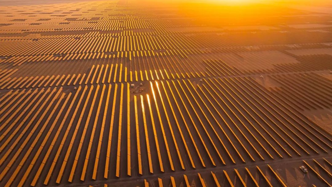 夕阳下,天际线被染成金黄色。中国绿发新疆若羌400万千瓦光伏项目就像一幅壮丽的现代科技画轴,在金色的阳光下展现出不同的风格。