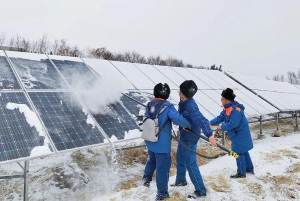 大雪过后,中广核山西大同光伏电站的运营人员正在清理光伏板上的积雪。