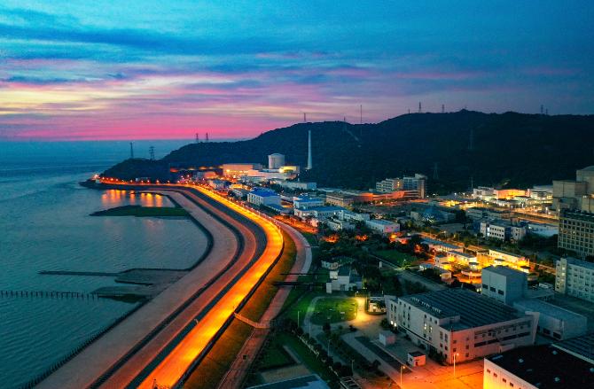 中核集团秦山核电晚上,天空呈现出梦幻般的色彩,就像一个巨大的调色板,给人一种宁静而神秘的感觉。