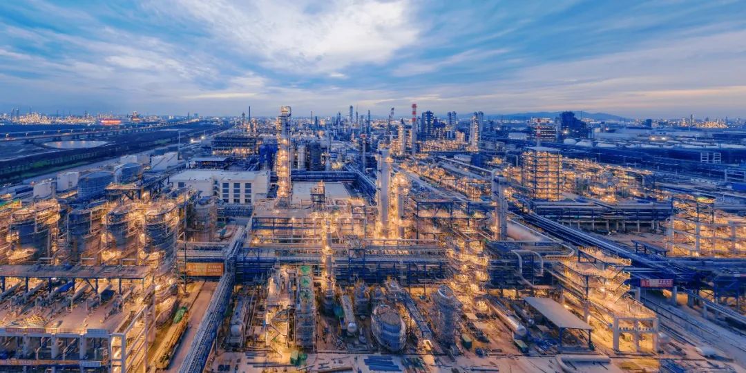 俯瞰东海之滨,灯火通明,犹如浩瀚的星辰。中国石化镇海炼化基地连绵起伏,犹如一片壮丽的“钢铁森林”。