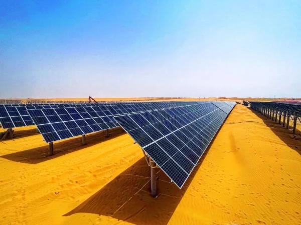 在这片金色的沙海中,华电腾格里“沙戈荒”大型风电光伏基地100万千瓦光伏二期项目一排排蓝色光伏板,就像一朵朵“太阳花”盛开。