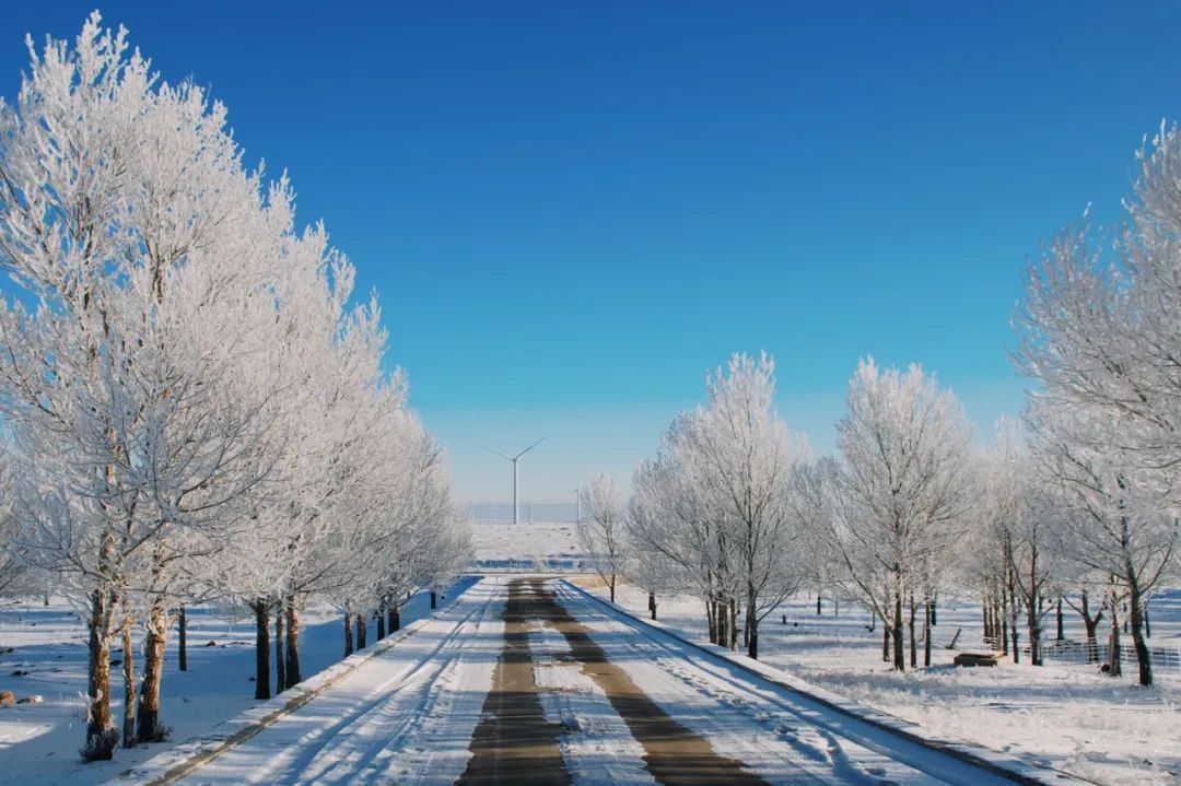 张北坝上的中节能满井风电场银装素裹,舞动的风机伴随着白杨挂满银霜,静静地矗立在冰雪云雾中。