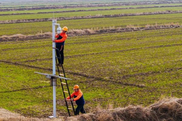 12月13日,在安徽省阜南县曹集镇阜蒙农场,冬季种植的小麦充满了绿色。中国电信人穿着橙色工作服走在田野里,检查智能农业设备。