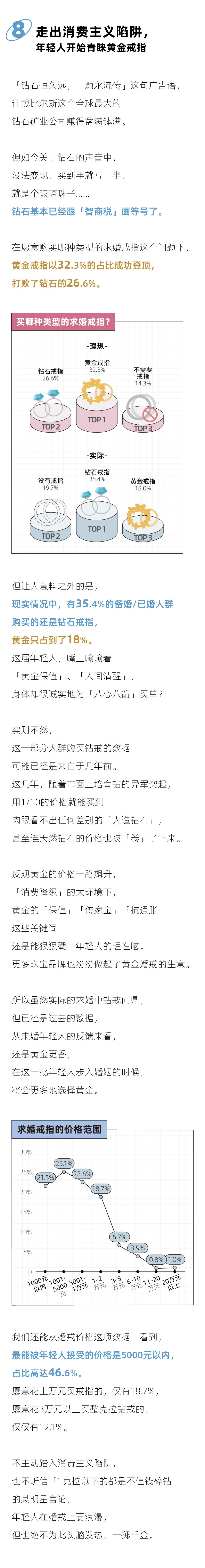 现实生活中,许多年轻人已不再关心彩礼、嫁妆那一套,新房子也不是某一方承担的责任,「一克拉以下的钻石是毫无价值的碎钻。」只是把它当成一个笑话,许多人认为金戒指更好。