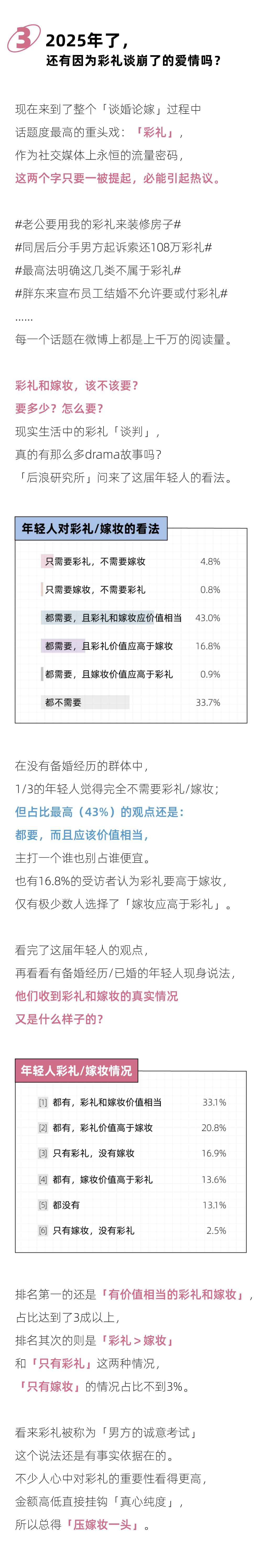 年轻人结婚需要经济基础吗?当然可以。有车有房的高额彩礼是必须的吗?「后浪研究所」问卷数据指向的答案是:非。