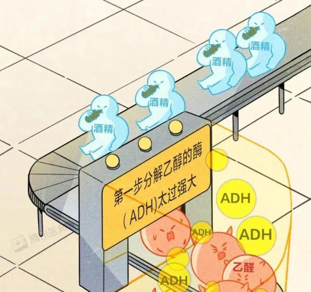 但是有的人体内,第一步就是“乙醇脱氢酶”过强,导致喝酒后体内迅速产生大量的“乙醛”。