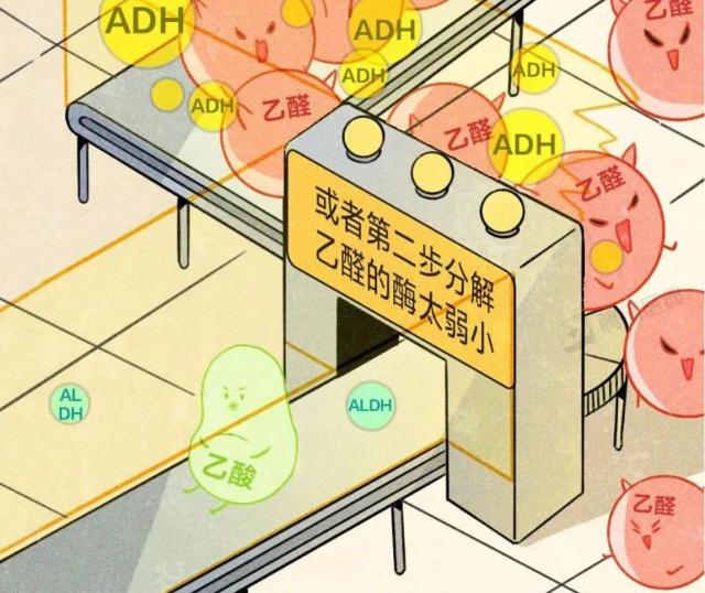 但在第二步中,乙醛脱氢酶的能力或数量不足,导致第一步产生。"乙醛"不能继续分解成乙酸,导致沉积…