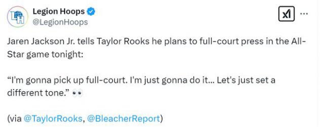 在此之前,第一次入选全明星的文班亚马表示将竭尽全力参加比赛,现在,小贾伦 - 杰克逊加入了他的队伍。杰克逊说:“我之前跟他们说过,我说,‘我要全场紧逼防守。“我只想这样做,因为,你知道,我们必须确定不同的基调。它是一种不同的游戏形式。很明显,你不想在一场比赛中被对手虐待。 40 分数(指分数差异较大)。"