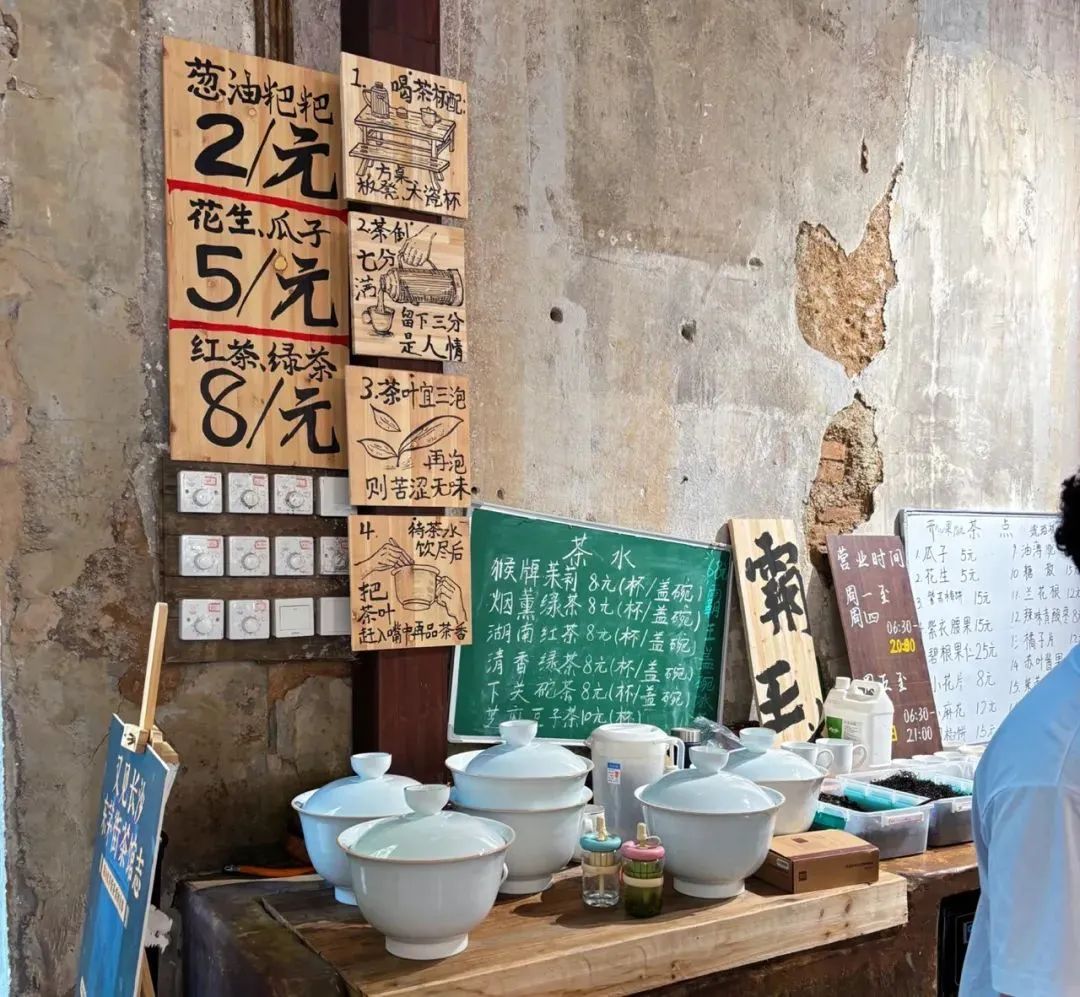 先来看看东茅街茶馆的价格,2块葱油粑粑,5块花生瓜子,8块红茶绿茶,各种性价比高的小吃。消费者需要拿着一个白色的大瓷罐,自己去盛热茶,这让他们感到充满了情感。与过去50元起步、华而不实的新中式茶馆相比,性价比不明显高出几倍。