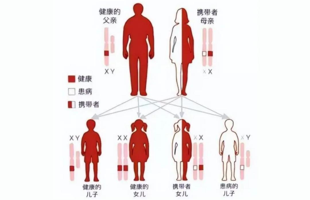 之后,经医学专家确认,当时欧洲王室成员流传的可怕疾病是“传男不传女”的遗传性血友病。血友病是由X染色体上的FVII或FIX基因异常引起的,是X染色体连锁的隐性遗传。