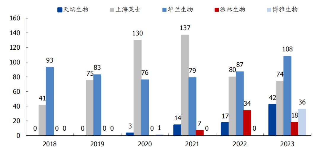 纵观血源凝血因子的格局,华兰生物和上海莱士是龙头企业,FVIII的批发量始终处于领先地位。然而,随着天坛生物、森林生物和博雅生物的逐渐努力,每个家庭基本上都有供应血液凝血因子的能力。
