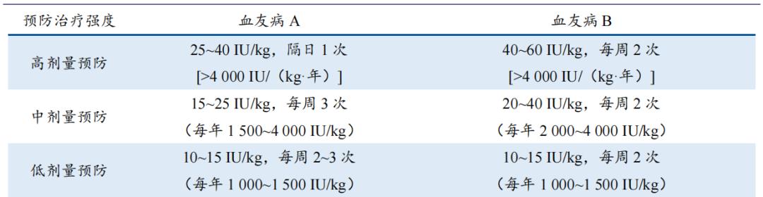 从另一个角度来看,血友病更像是一种慢性疾病。定期给予规律的替代治疗,以避免出血,被称为血友病治疗的最佳方案。国际主流给药方案为中剂量(每剂量) 15-30IU/kg,A型血友病病人每周给药。 3 第二,B型血友病病人每周都有 2次)和大剂量(每剂量) 25-40IU/kg,A型血友病患者隔日1第二,B型血友病病人每周都有 2次),而我国目前仍然采用小剂量方案,(A型血友病患者10 IU/kg,每周2~ 3次;B型血友病患者20 IU/kg,每周1次)。