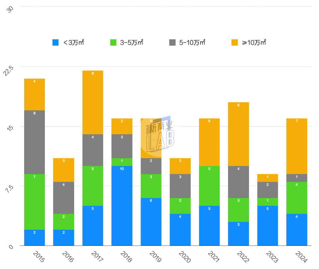 其中,10万㎡上述项目有7个,5万个。㎡至10万㎡有一个项目,三万个㎡至5万㎡有四个项目,三万个㎡下面的项目有4个,可以看出去年新进入市场的项目大多是大型商场。