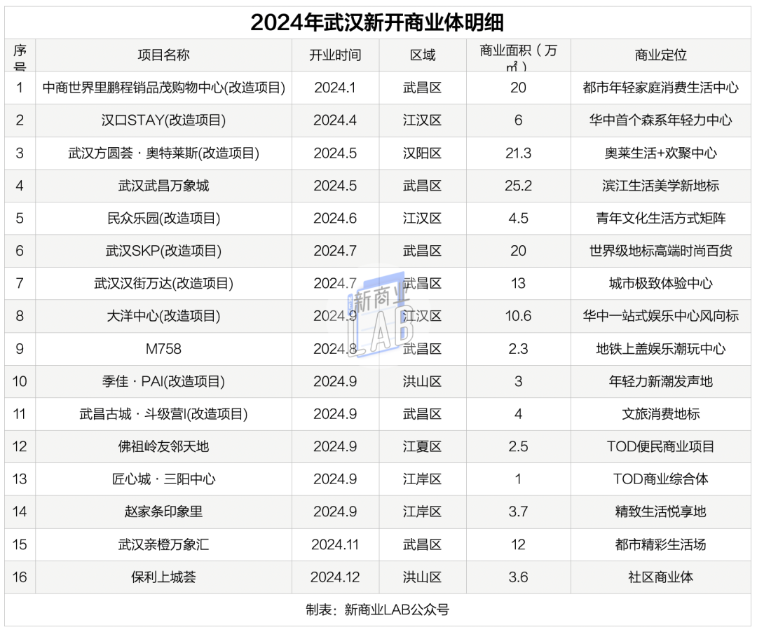 据「新型商业LAB」据不完全统计,2024年武汉共迎来16个新开业(含改造)商业项目。