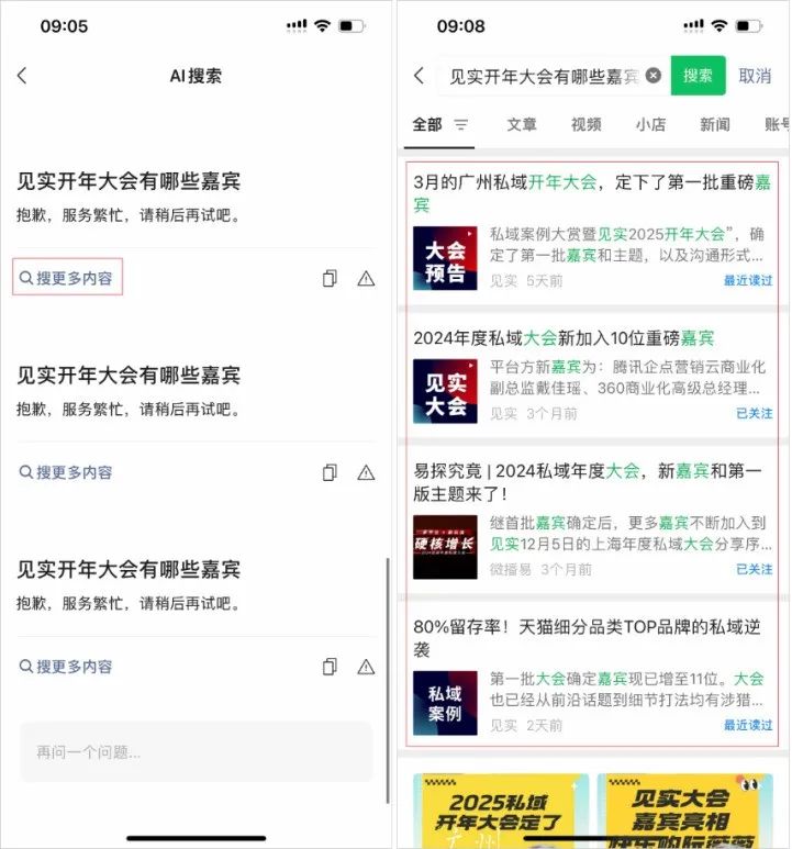 然而,在测试中,当第二个问题是真实的时候,AI搜索出现了“服务器繁忙”的提示,经过多次尝试,仍然没有成功。另外,点击页面中的“?搜索更多内容”将回到一般搜索界面,并呈现相关文章。