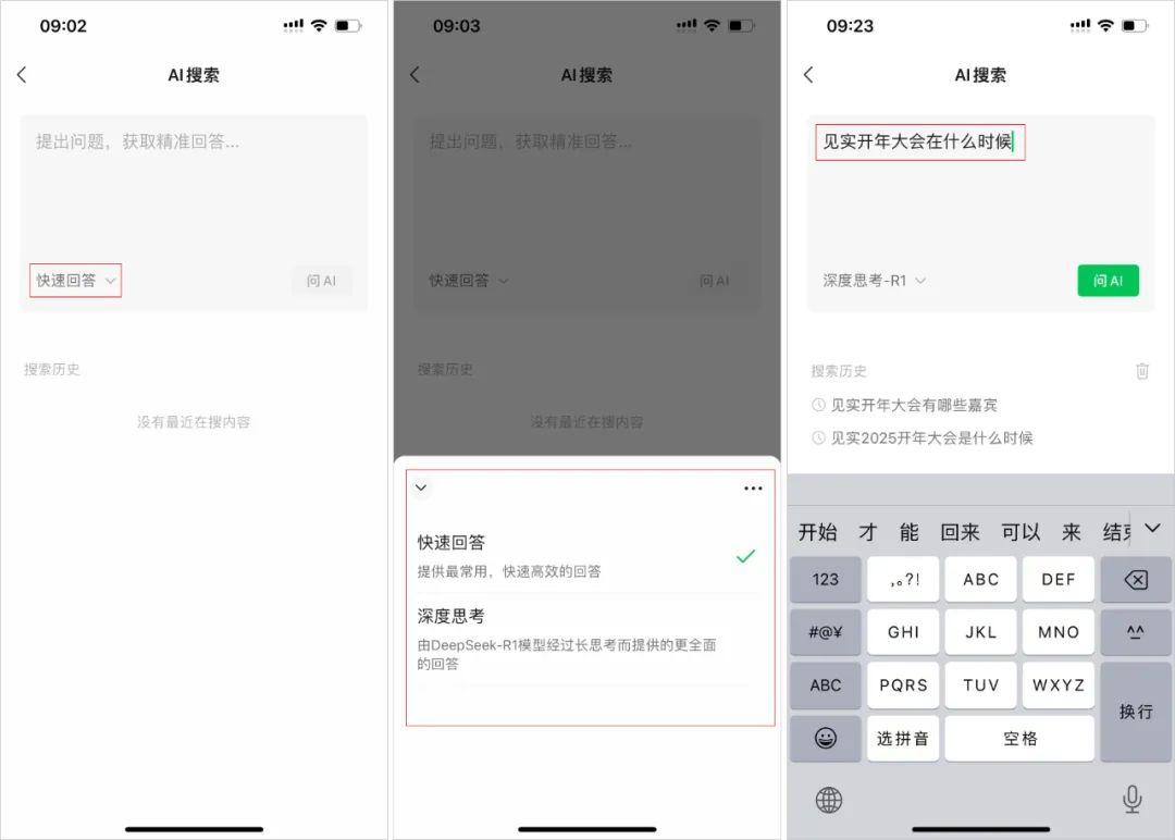进入“AI搜索”后,默认为“快速回答”。继续点击“快速回答”,选择“深度思考”的方式,即可感受到DeepSeek。 R1提供深度回答。