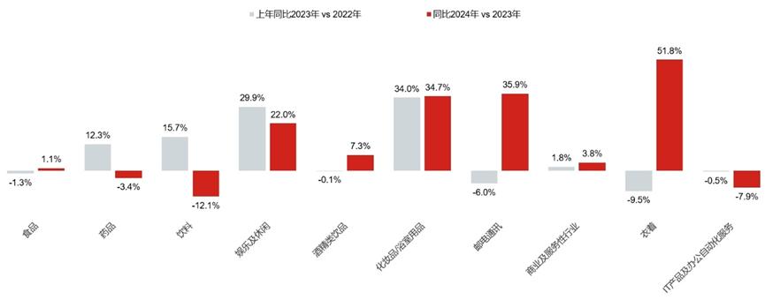 2024广告市场整体TOP10行业(大类)广告费用发生变化,