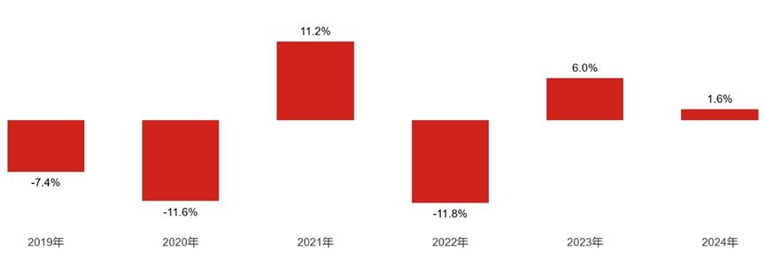 在经济复苏和技术创新的推动下,中国媒体广告市场呈现稳定增长,市场规模不断扩大。基于CTR媒体智讯Ad 数据库中的Cube广告数据,2024年广告市场总体同比增长1.6%,在合理的范围内,整个市场保持着波动的趋势。