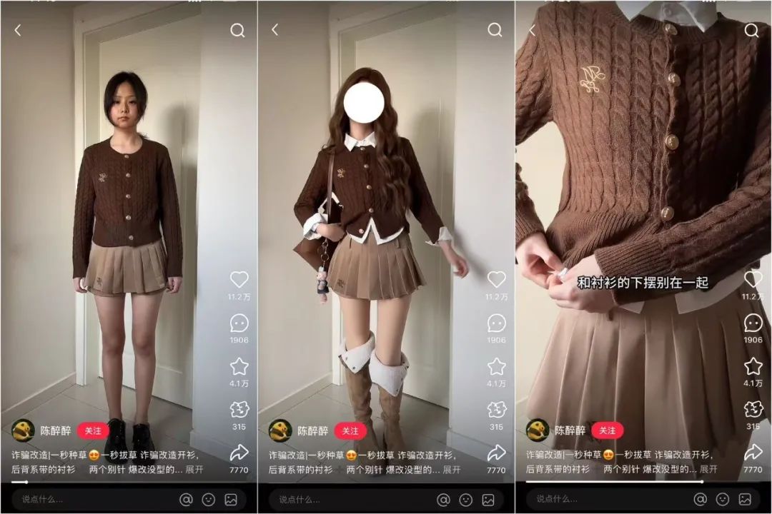 穿着博主@陈醉醉 在竞争激烈的时尚领域中,凭借《诈骗改造|一秒种草一秒拔草》系列视频脱颖而出。这一系列内容的独特之处在于,在视频开头,博主会在几秒钟内展示普通单品的普通穿搭,然后展示自己改造后的“风格化穿搭”。