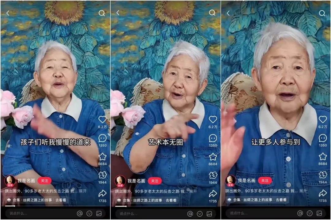 绘画博主@我是名画 虽然她已经是一位90岁的老奶奶了,但她非常“时尚”。她选择在小红书里和大家分享她的艺术作品。她像亲切的邻居奶奶一样,教给用户一些实用的绘画技巧,并与他们进行技巧和审美交流,深受客户的喜爱和尊重。