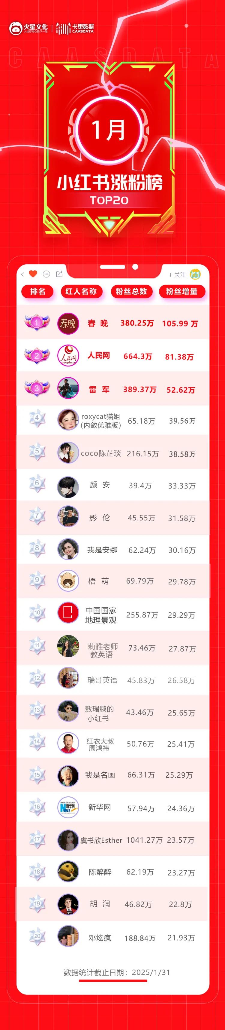新年新气象,2025年第一个月小红书迎来了怎样的开局?让我们一起来看看一月涨粉榜: