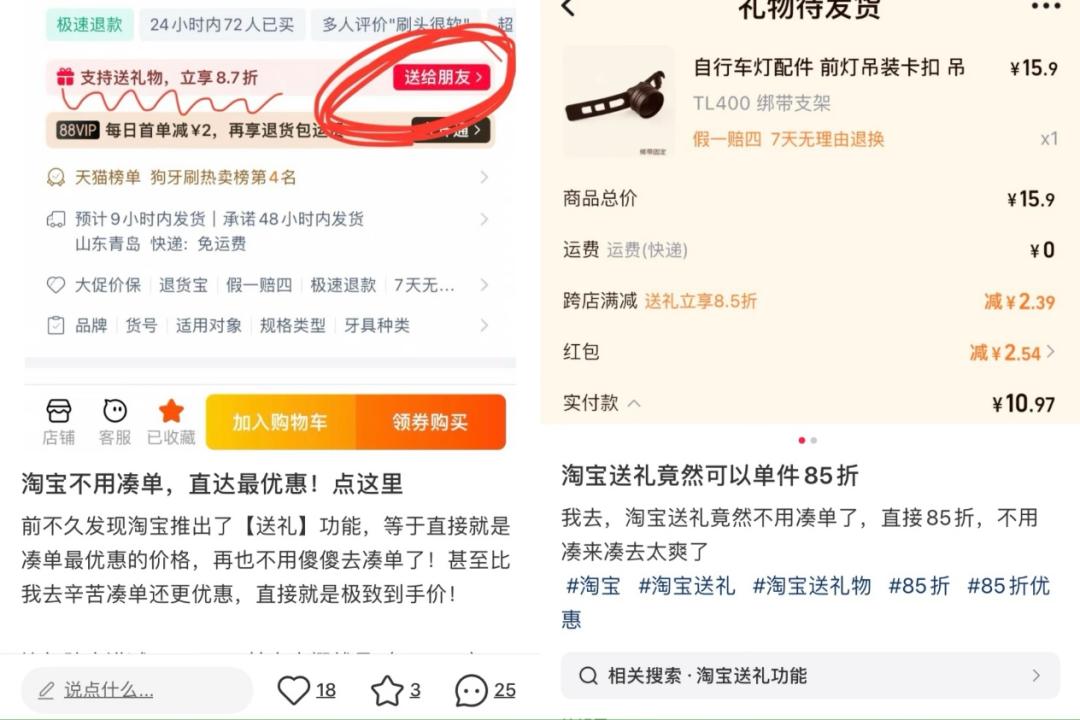 因为淘宝的很多产品都支持“送礼,享受8.7折”,很多消费者用自己的大号下单,给新号,相当于自己以折扣价买。还有网友提到,“可以发给朋友,让他填写你的地址。在微博、小红书等社交媒体上,很多与“淘宝送礼物”相关的笔记都与“羊毛”挂钩,其中有标题为“不需要填满或减少”的笔记,称“这个新的送礼功能直接无痛打八五折,现在改成九折,但还是很适合只有一个想买的,不用费心填满或者减少...我直接填写我的地址,大小号互相送。”